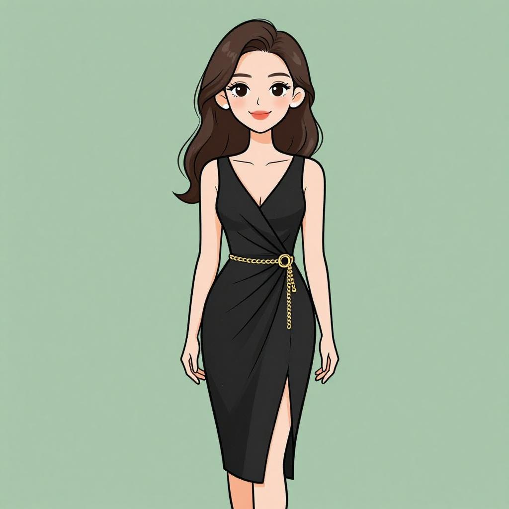Woman with pretty face and pretty hair. smiling Woman, evening wear, sleeveless black mini dress with draped fabric, asymmetric neckline, gold chain belt with tassel, chic. --sref 1467