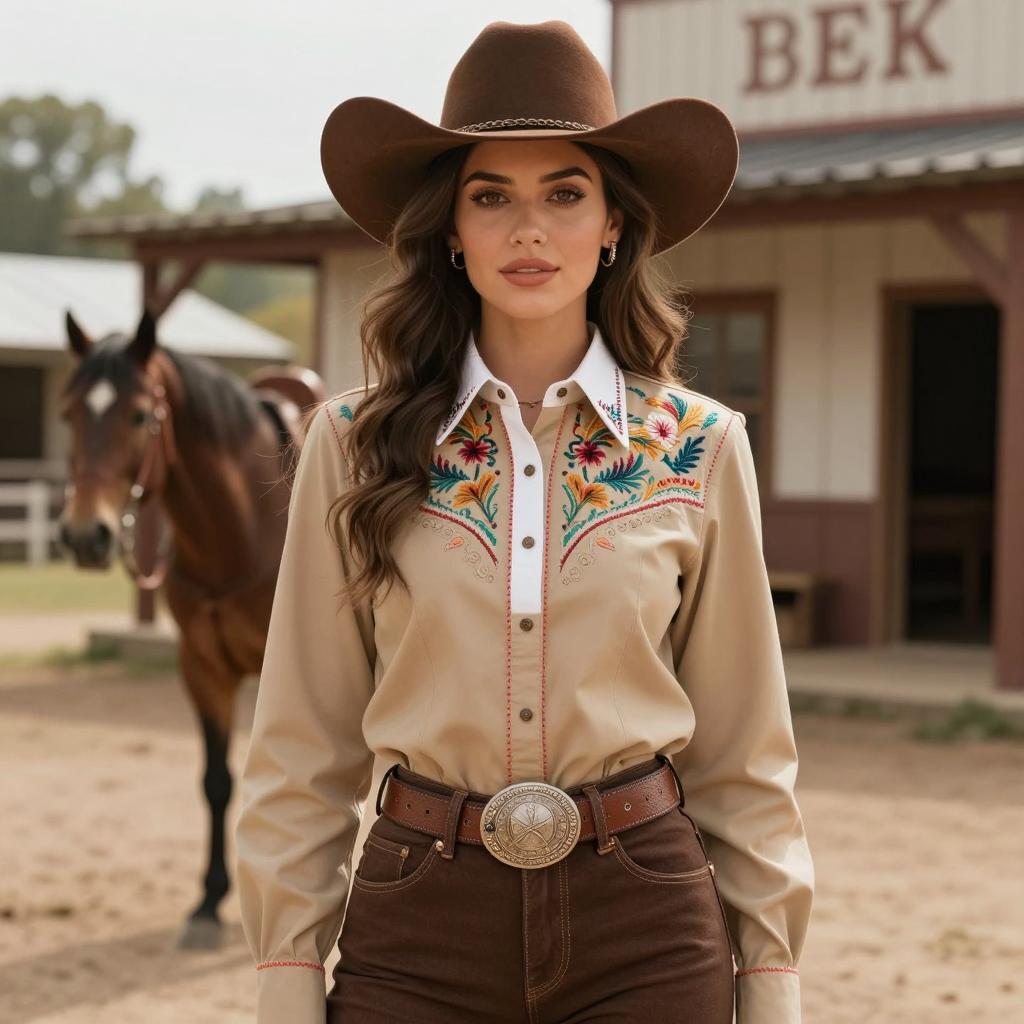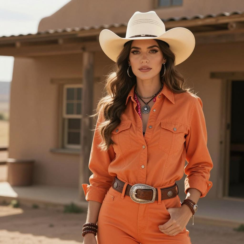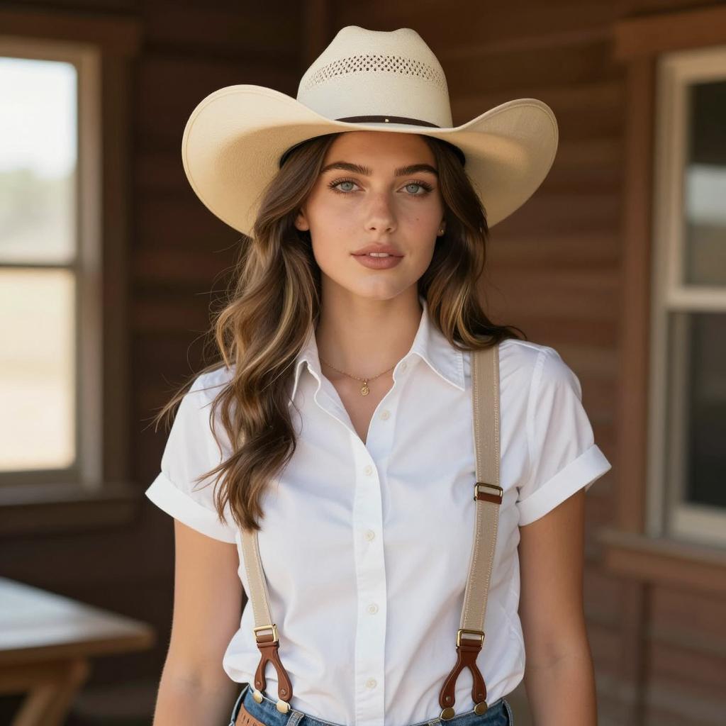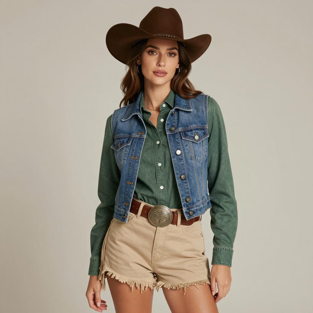 Girls cowgirl costume, photorealistic, woman, cowboy outfit, brown leather jacket, red bandana, tan cowboy hat, brown leather shorts with fringe, belt with circular buckle, long wavy brown hair, standing, wooden background, sunlight, realistic ures, western style, confident expression, detailed clothing, warm colors, realistic shadows, daytime