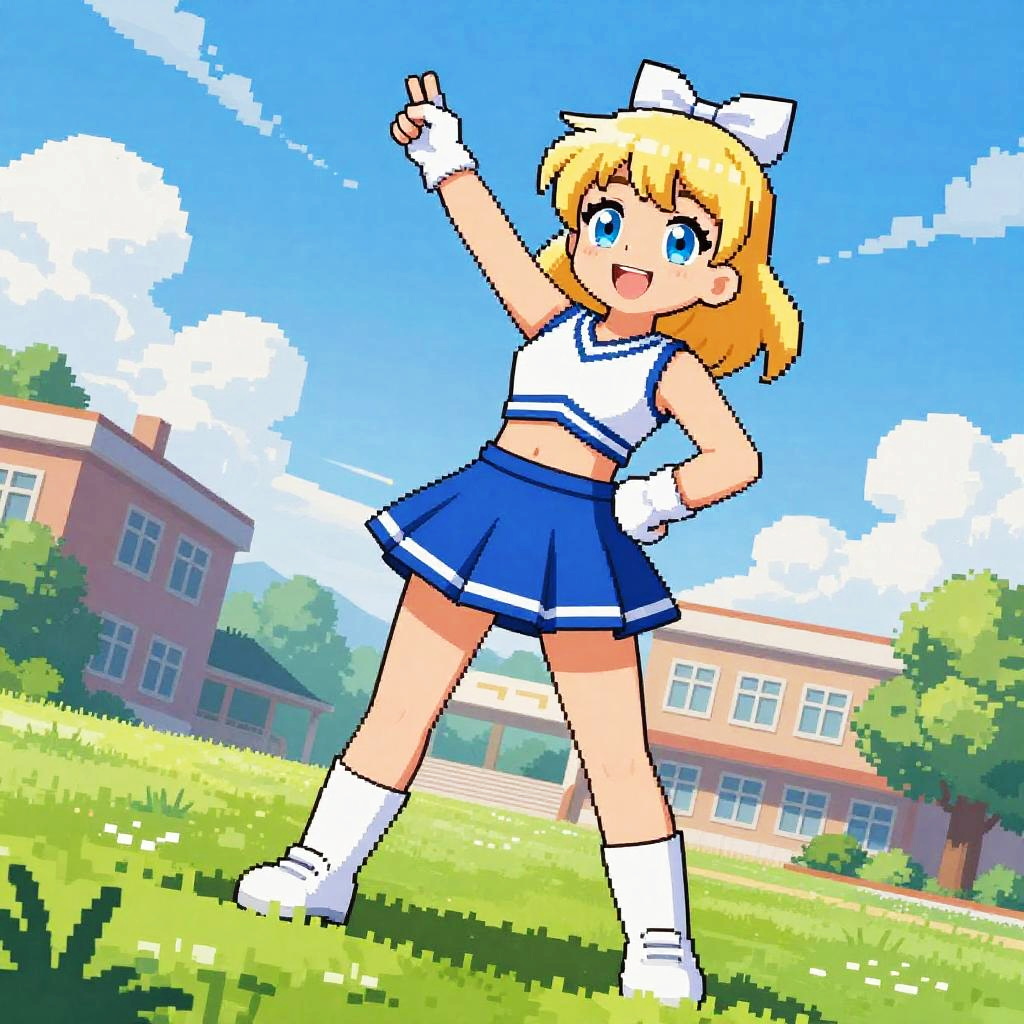 1girl cheerleader, (PixelArt:1), (blue eyes, skirt, uniform, makeup, blonde, gloves), curvy, looking at viewer, smile, :D, from below, cute pose, (detailed landscape, school, grass, clouds:1.2), (background:1), (dynamic_angle:1.2), (dynamic_pose:1.2), (rule of third_composition:1.3), (dynamic_perspective:1.2), (dynamic_Line_of_action:1.2), solo, wide shot, (masterpiece:1.2), (best quality, highest quality), (ultra detailed), (8k, 4k, intricate), (full-body-shot:1), (Cowboy-shot:1.2), (50mm), (highly detailed:1.2), (detailed face:1.2), detailed_eyes, (gradients), (ambient light:1.3), (cinematic composition:1.3), (HDR:1), Accent Lighting, extremely detailed, original, highres, (perfect_anatomy:1.2)