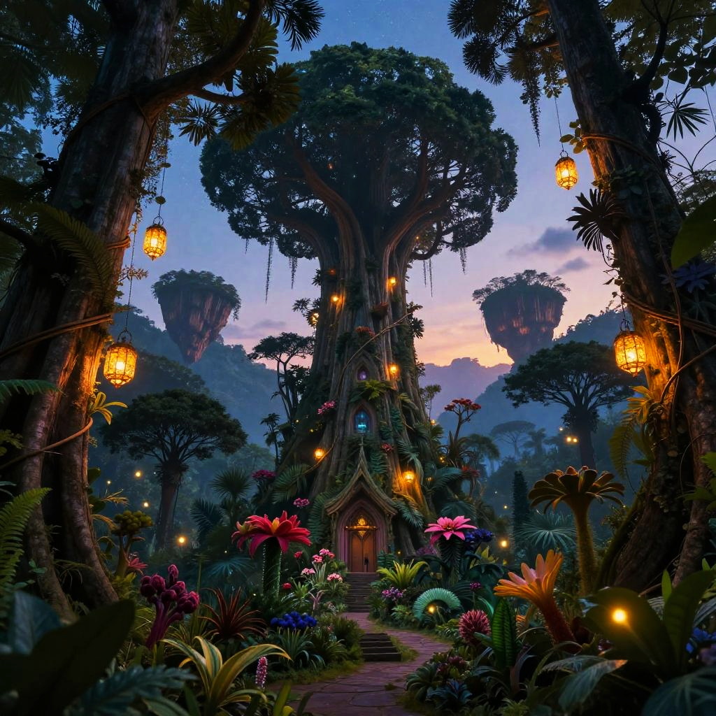 An epic scene featuring lushstoties inhabiting a magical jungle, with towering trees wrapped in glowing lanterns, exotic blossoms, and wandering fireflies, set against a twilight sky filled with stars and distant floating islands.