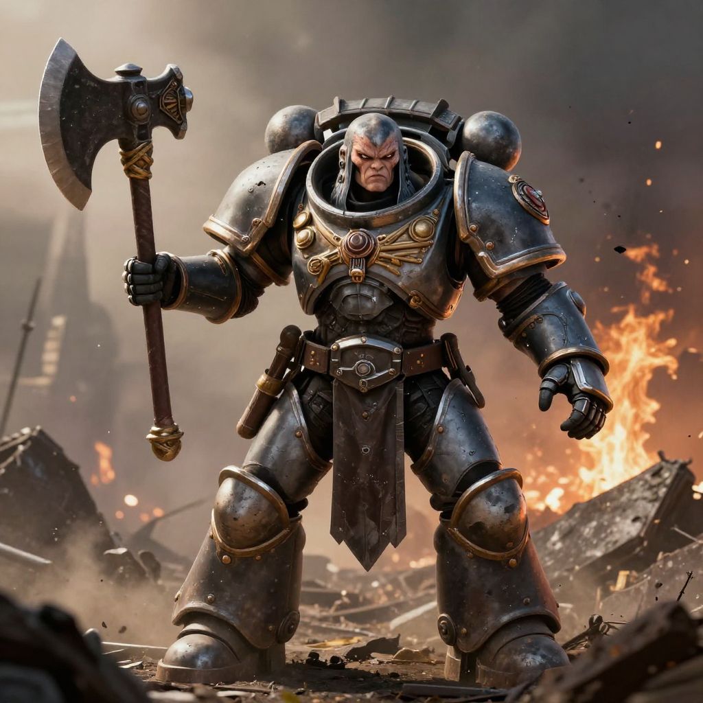 Digital art of a muscular, armored warrior with a large axe, standing amidst a burning battlefield, wearing detailed, metallic armor.