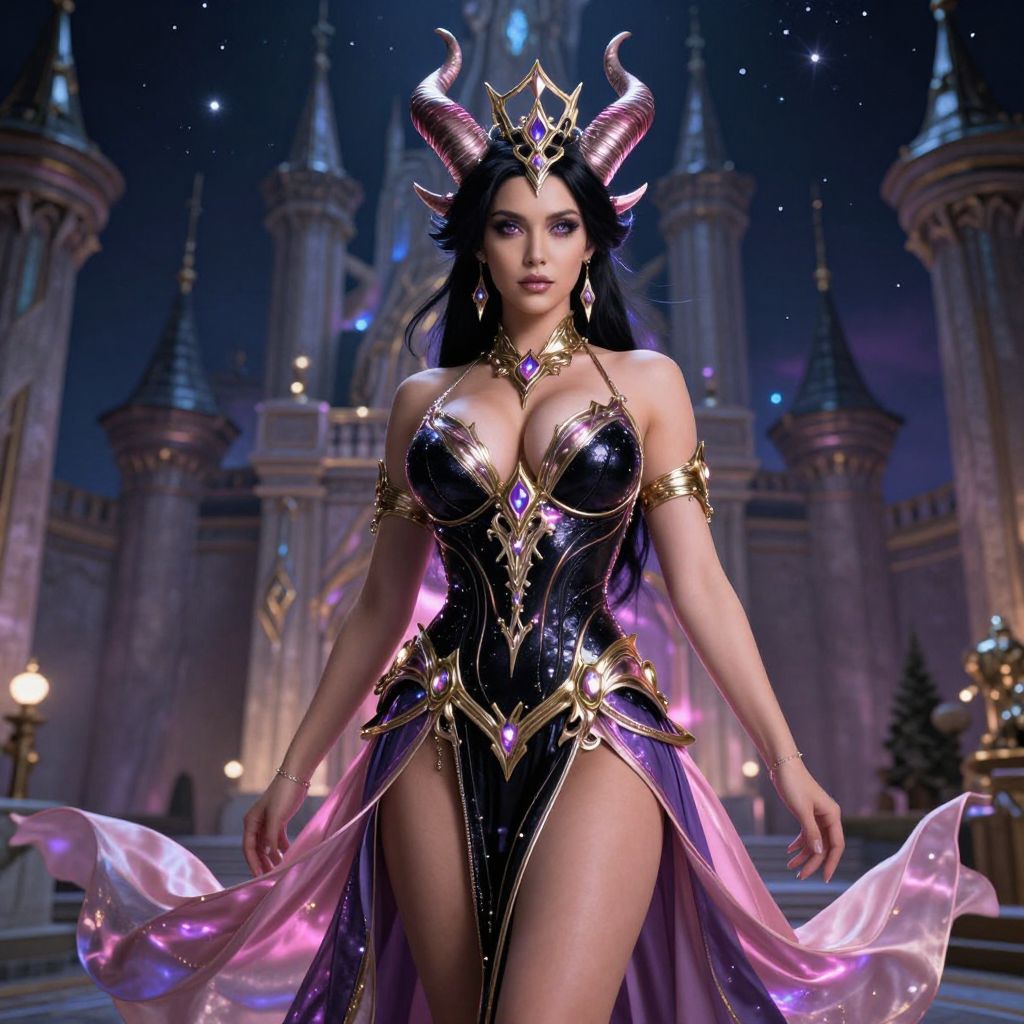 A sexy woman with big tits, towering horns, and a majestic crown on her head, wearing a dazzling black and gold costume with intricate detailing, a flowing pink and purple skirt that drapes elegantly, glowing with a mystical aura, standing in a fantasy castle courtyard under a starry night sky, her eyes shimmering with power and allure, hyper-detailed, cinematic lighting, fantasy art style, 8K resolution, ultra-realistic skin texture, dramatic shadows, and a sense of regal dominance.