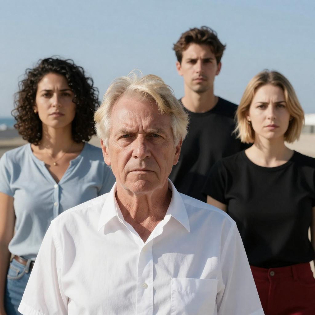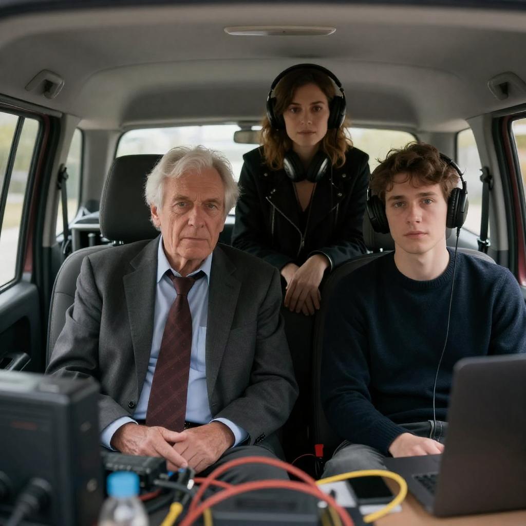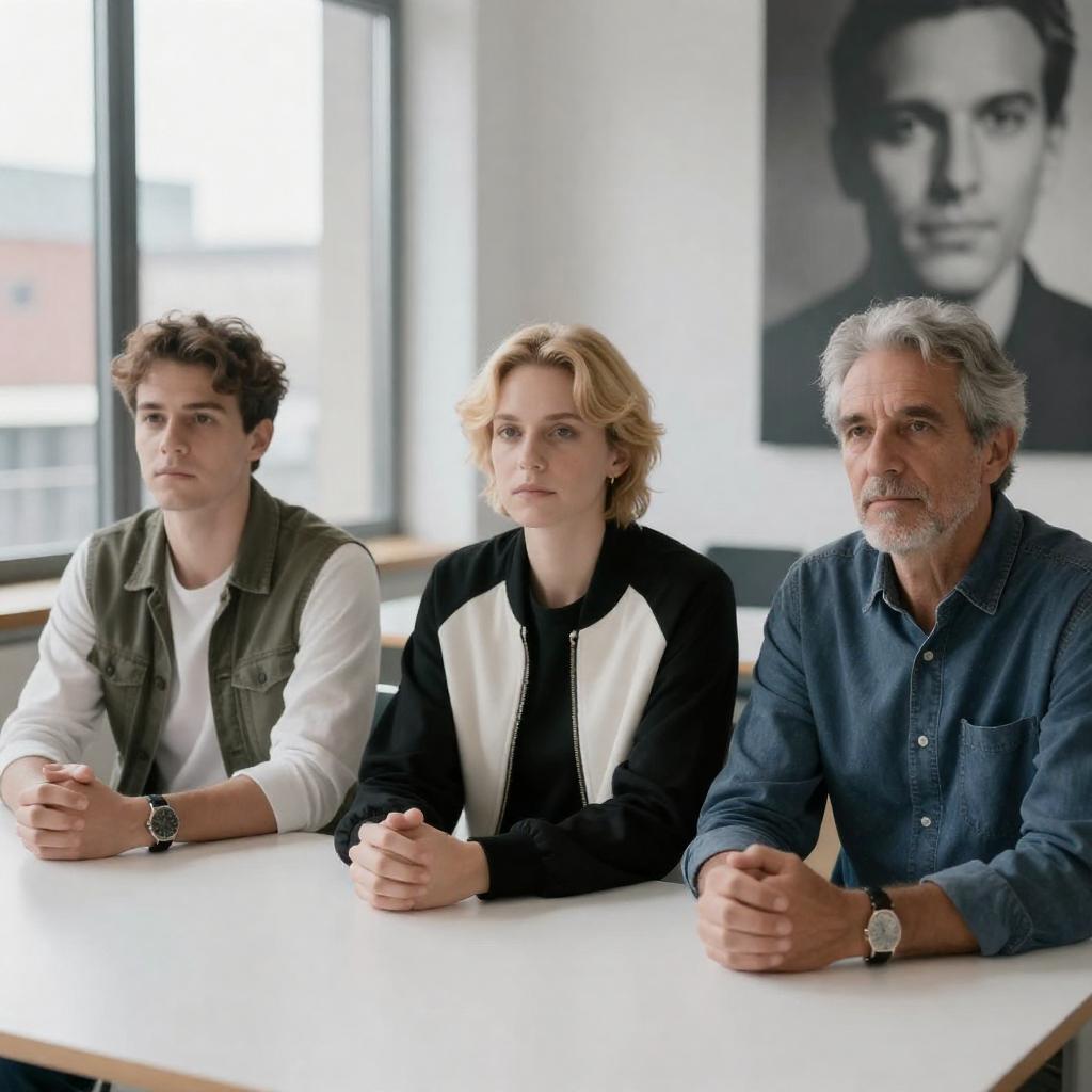 Photograph of three people sitting at a white table. Young man on left with short brown hair, green vest over white shirt. Middle person with blonde hair, black and white jacket. Older man on right with gray hair, blue shirt. All looking serious. Background includes large window with cityscape and black-and-white portrait on wall.