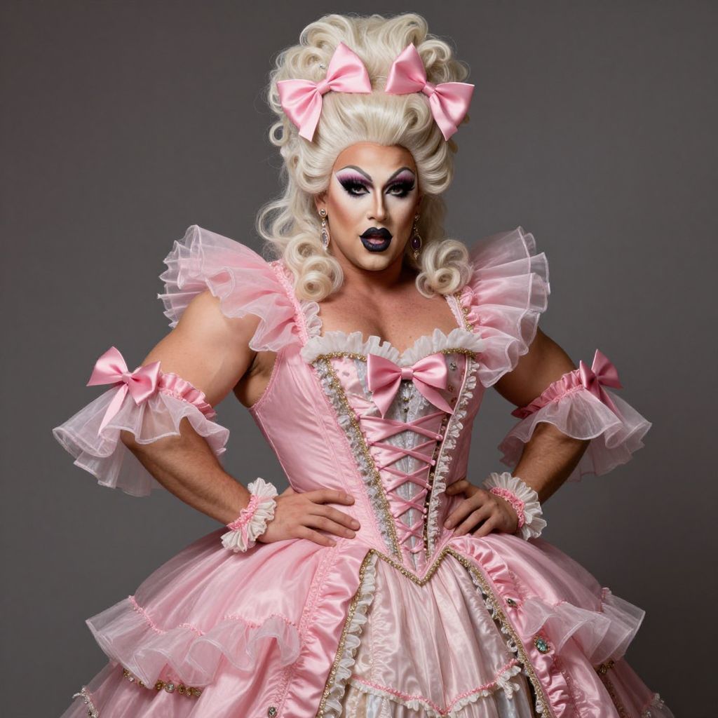 Photograph of a muscular, light-skinned individual with voluminous, platinum blonde hair styled in an elaborate updo, adorned with pink bows. They wear a frilly, pink, Victorian-style dress with lace, bows, and intricate gold trim. The dress features puffed shoulders, a corset-like bodice, and multiple layers of pink tulle. The person's makeup is dramatic, with dark, smoky eyes and bold, black lipstick. They pose confidently with hands on hips against a plain, dark gray background. The overall style is flamboyant and glam-rock, with a strong, theatrical presence.