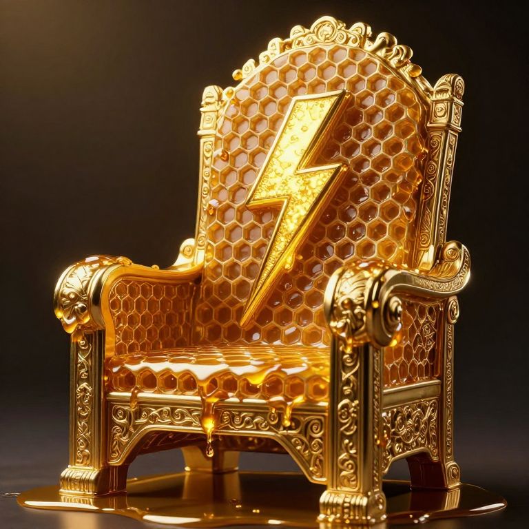 A golden throne made of honey comb, inside of each comb is a glowing gold lightning symbol, dripping golden honey drops, dripping liquid gold, golden reflections, intricate details // detailed digital hyper realistic intricate details, HDR, beautifully shot, sharp focus, 64 megapixels, high contrast, cinematic, atmospheric, moody