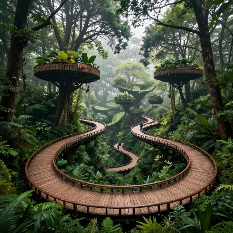 Spiraling wooden pathways weave through a lush, ethereal forest where gravity seems to bend, inviting visitors to traverse a dreamlike landscape of suspended trees and misty canopies.