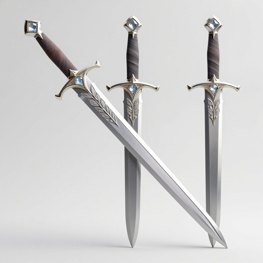Photograph of four ornate swords arranged in a diagonal formation against a white background. Three swords stand upright, each with a silver blade, dark brown or black leather-wrapped hilt, and an intricate silver crossguard adorned with blue gemstones. The fourth sword lies horizontally across the others, displaying a similar design. The blades have a polished, reflective surface, and the crossguards feature delicate leaf patterns. The gemstones are square-cut and add a touch of elegance. The hilt's texture contrasts with the smooth, shiny blades. The overall style is sleek and medieval-inspired.