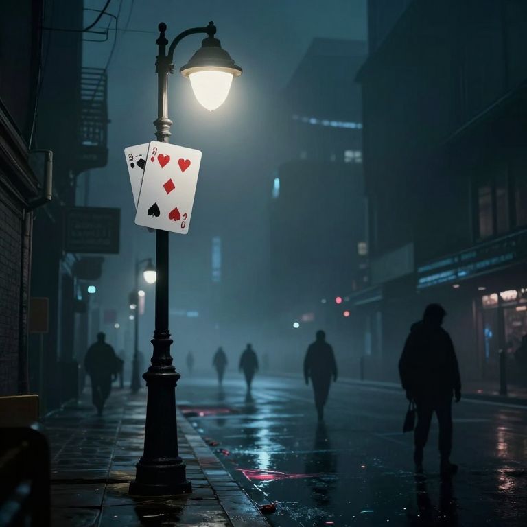 A cyberpunk-inspired digital artwork depicts a hauntingly atmospheric street scene illuminated by a glowing streetlamp adorned with playing cards, casting eerie reflections on the wet pavement as shadowless figures drift through the misty urban landscape.