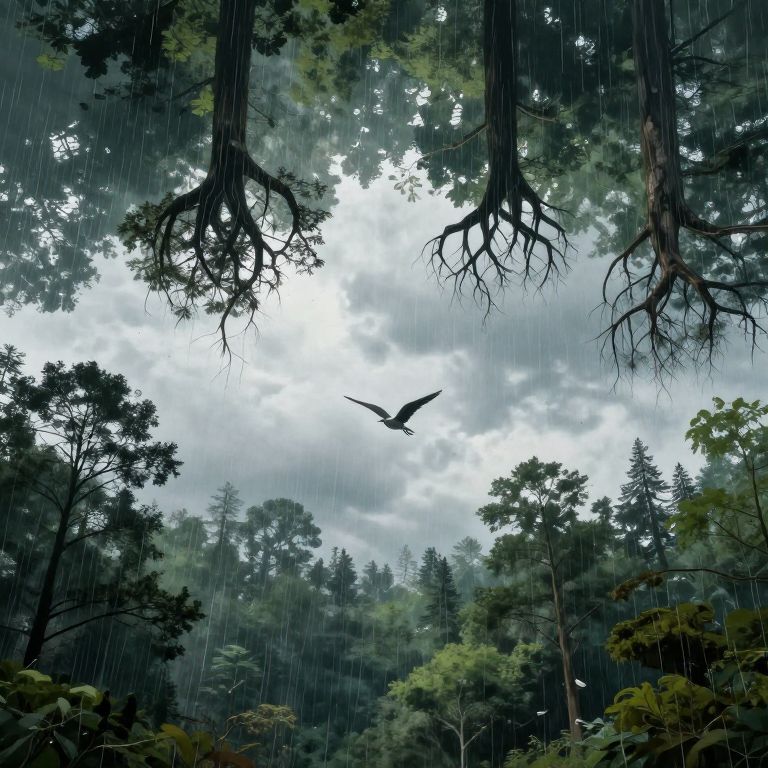 A forest where trees grow upside-down from the sky, roots snorkeling into rain clouds, while wingless birds float calmly in the air.