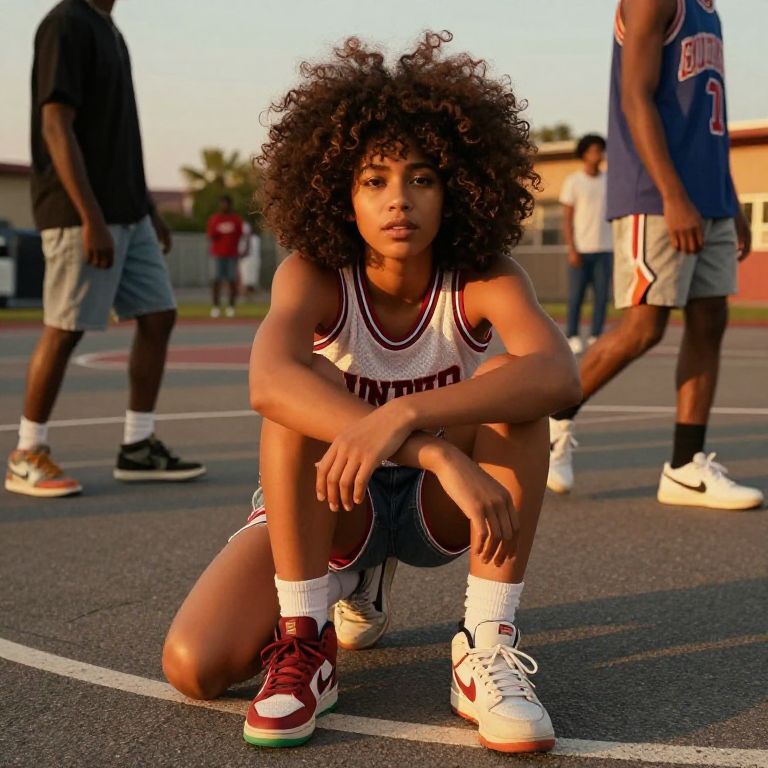 Photograph of a young Black woman with voluminous curly hair, kneeling on an outdoor basketball court. She wears a white and black basketball tank top, black shorts, white socks, and maroon and white high-top sneakers. Her arms rest on her knees, and she gazes directly at the camera with a serious expression. In the background, three other men, partially out of frame, stand casually, wearing basketball gear. The court has white lines and a red stripe, with a blurred urban landscape and trees in the distance. The sunlight casts warm, golden hues, enhancing the scene's vibrant colors.