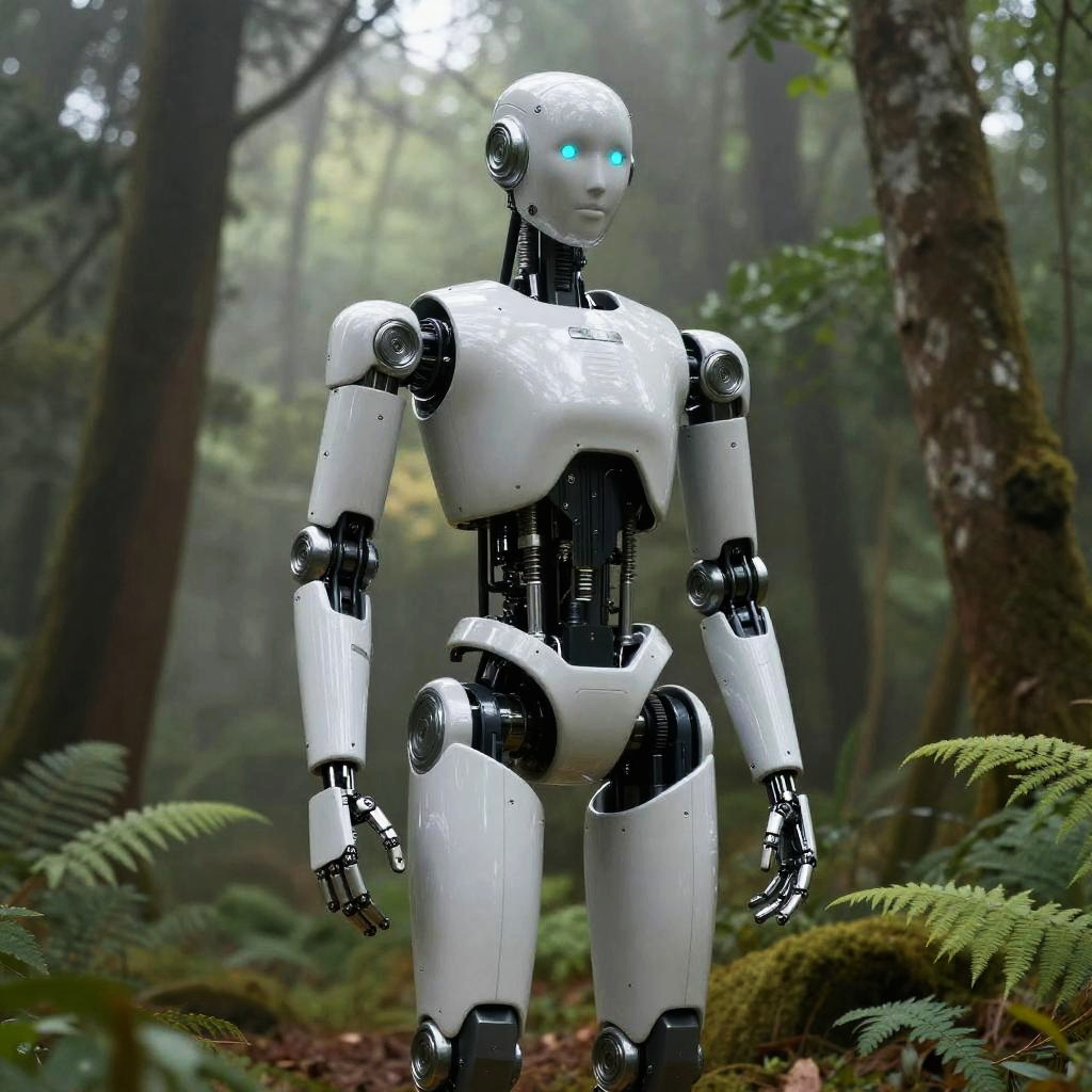 Photograph of a white, humanoid robot with black joints standing in a misty forest. The robot has glowing blue eyes and a sleek, futuristic design. Its arms and legs are articulated, and it has a smooth, metallic surface. The forest background features tall trees, moss-covered trunks, and dense green ferns on the forest floor. The light filtering through the trees creates a mystical, ethereal atmosphere. The robot is centered in the image, with the forest blurred slightly to emphasize depth.