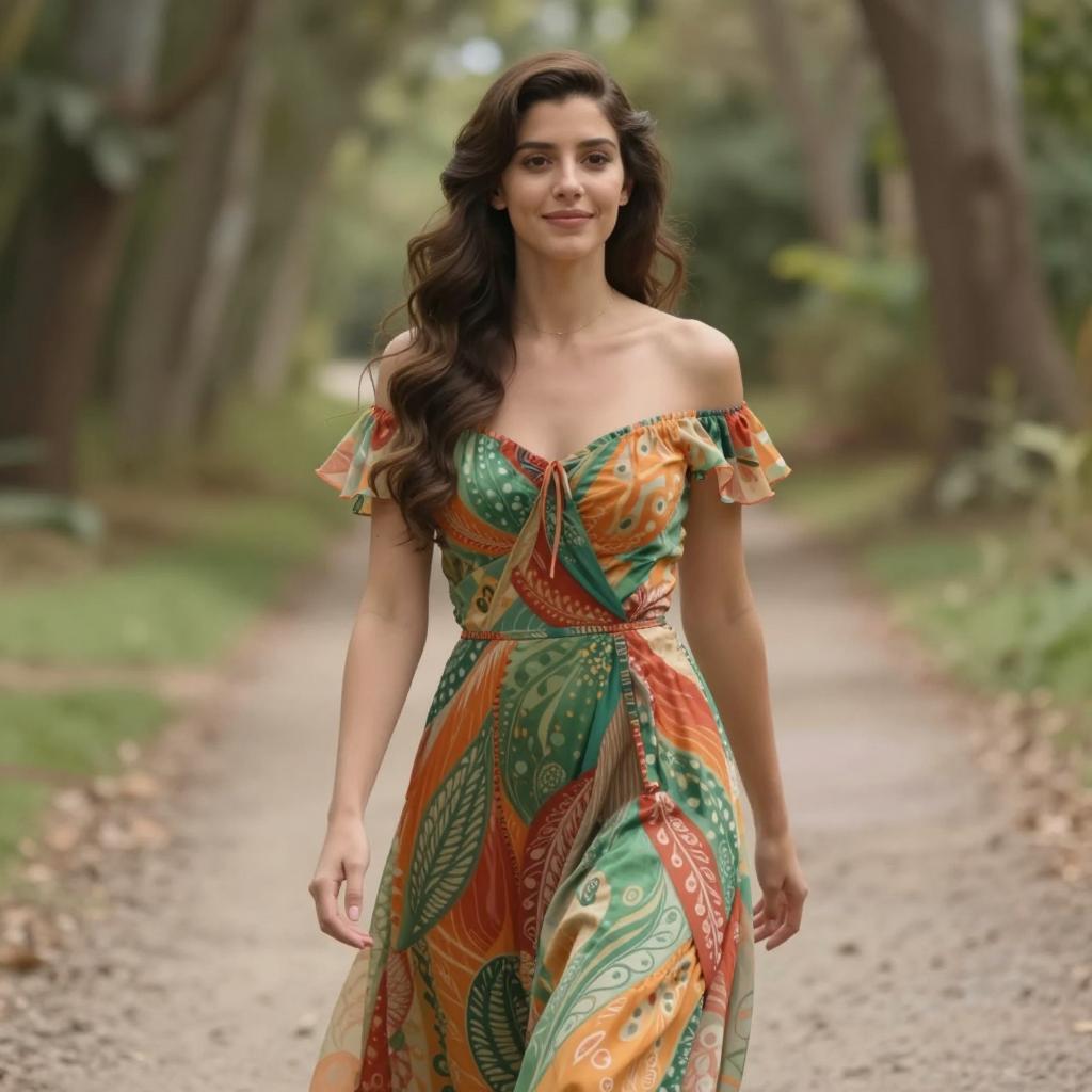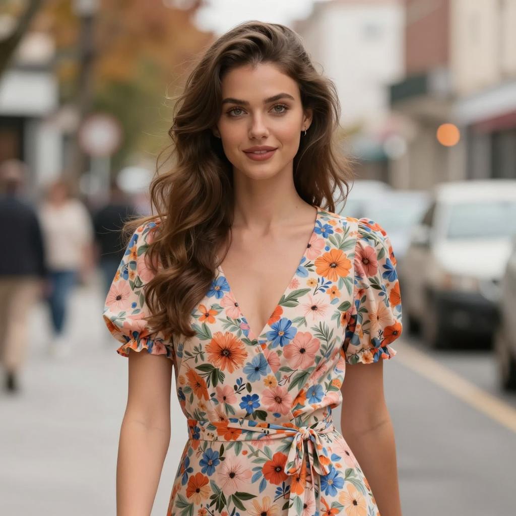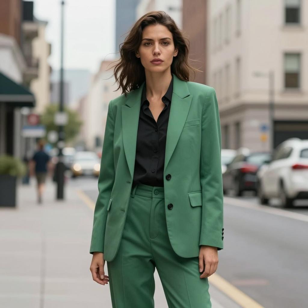 Umbrella plazo suit, photorealistic, young woman, long wavy brown hair, green floral blazer, white shirt, holding transparent umbrella, standing on sidewalk, greenery background, daytime, confident expression, casual style, medium shot, soft lighting, slight bokeh effect, urban park setting, realistic ures, fashion photography, natural light
