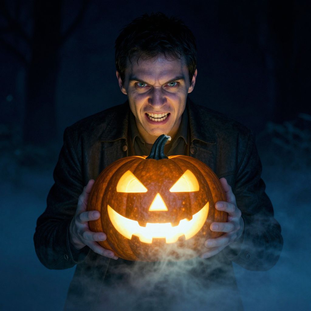 Photograph of a man with short dark hair and intense expression, holding a glowing jack-o'-lantern with triangular eyes and a wide, triangular mouth. He is wearing a dark jacket and the background is shrouded in blue fog. The jack-o'-lantern's light casts a warm glow on his face, highlighting his determined and slightly menacing look. The overall atmosphere is spooky and Halloween-themed, with the blue fog adding a mysterious, eerie effect.