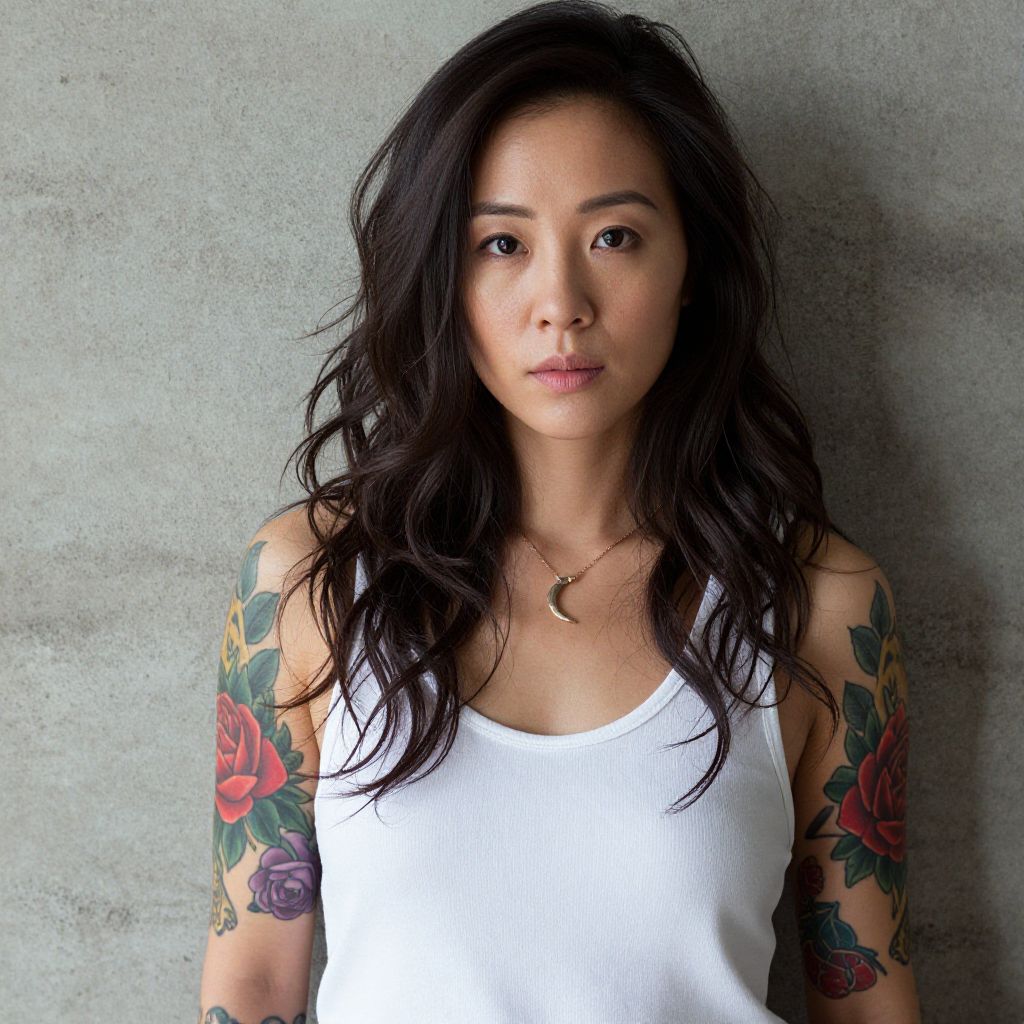 Photograph of an East Asian woman with long, wavy black hair, wearing a white, ribbed tank top. She has a neutral expression and is looking directly at the camera. Her arms, which are visible, are adorned with vibrant, colorful tattoos featuring roses and other floral designs. She wears a delicate gold necklace with a small pendant. The background is a plain, textured gray wall, providing a simple, contrasting backdrop to her colorful tattoos and white top. The lighting is soft, highlighting her face and tattoos.