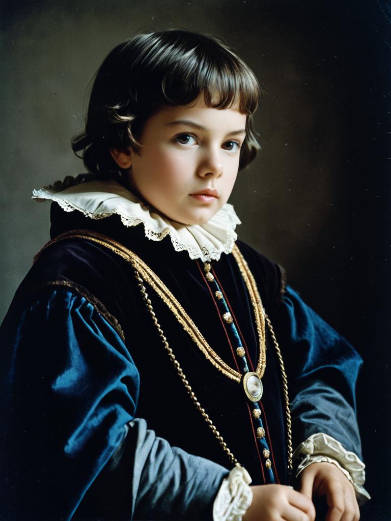 Child in Galileo Galilei Costume, cinematic realism, historical editorial portrait