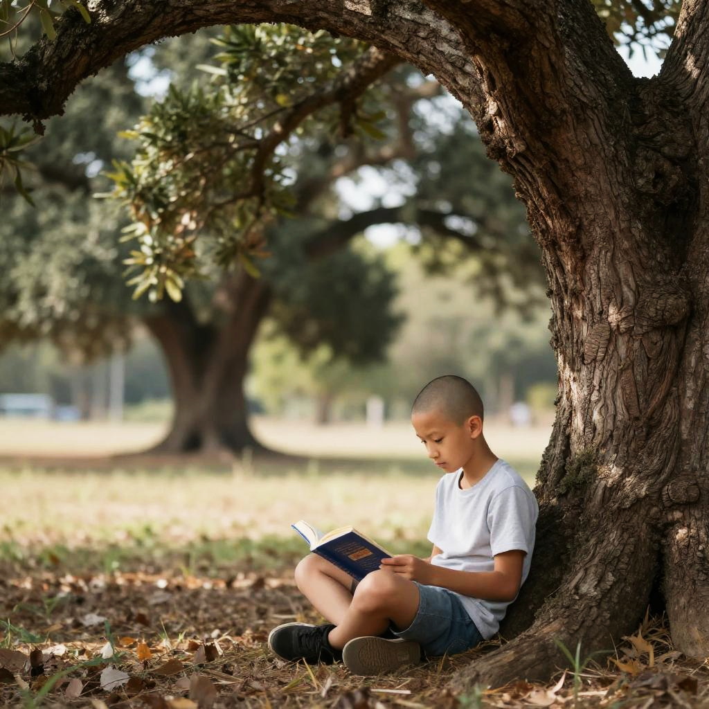 Preteen glasses worn by a bright boy reading a book under a large oak tree in a park, golden hour sunlight filtering through leaves, casual modern outfit, sharp focus on the glasses and facial features, serene background