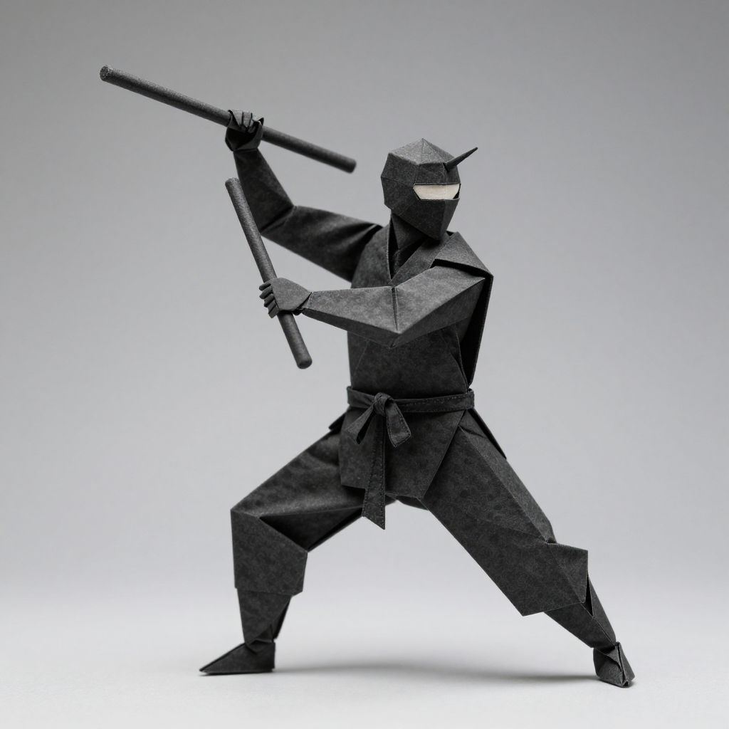 Origami master splinter, human sized, animated, epic, ninja, martial arts skills, action shot with bo staff,