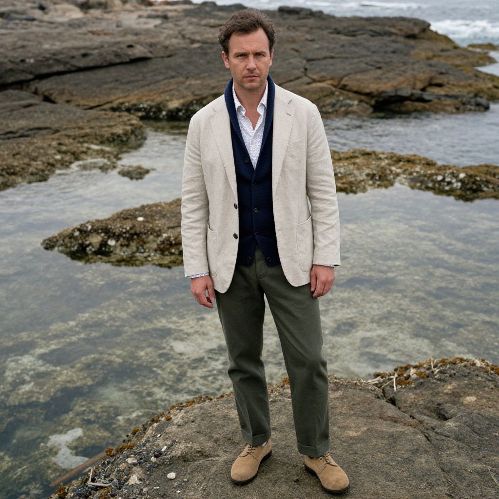 A man, light beige linen blazer, navy merino wool cardigan, patterned white dress shirt, olive green dress pants, tan suede derbies, secluded rocky coastline, tide pools teeming with life, Cibachrome style, contemplative expression. Man has masculine face and piercing eyes
