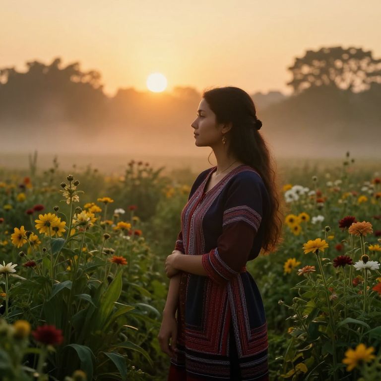 Cuclilla pose in a lush garden during golden hour, surrounded by blooming flowers and soft mist, warm hues of sunset light, intricate details on traditional attire, peaceful and introspective vibe, ultra-realistic painting.