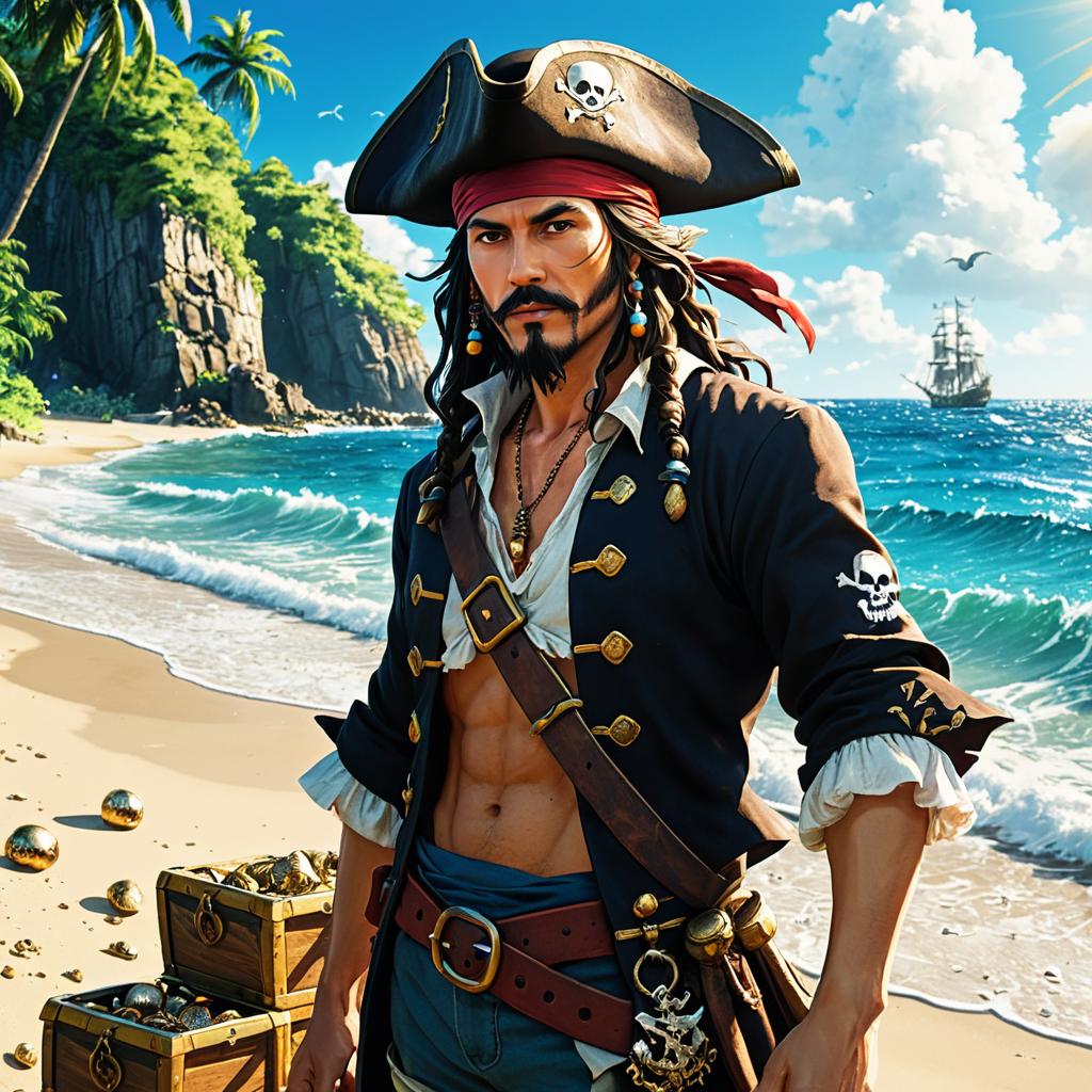 A daring pirate, with a tattered tricorn hat and an eye patch, surrounded by rolling waves and gleaming treasure chests, in a sunlit tropical island shore, depicted in the playful and engaging anime style of The Anime Man.