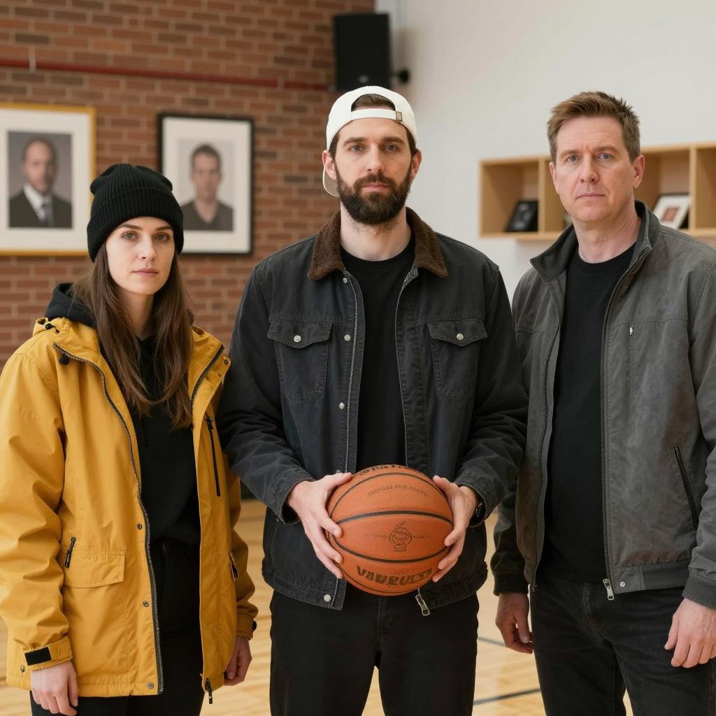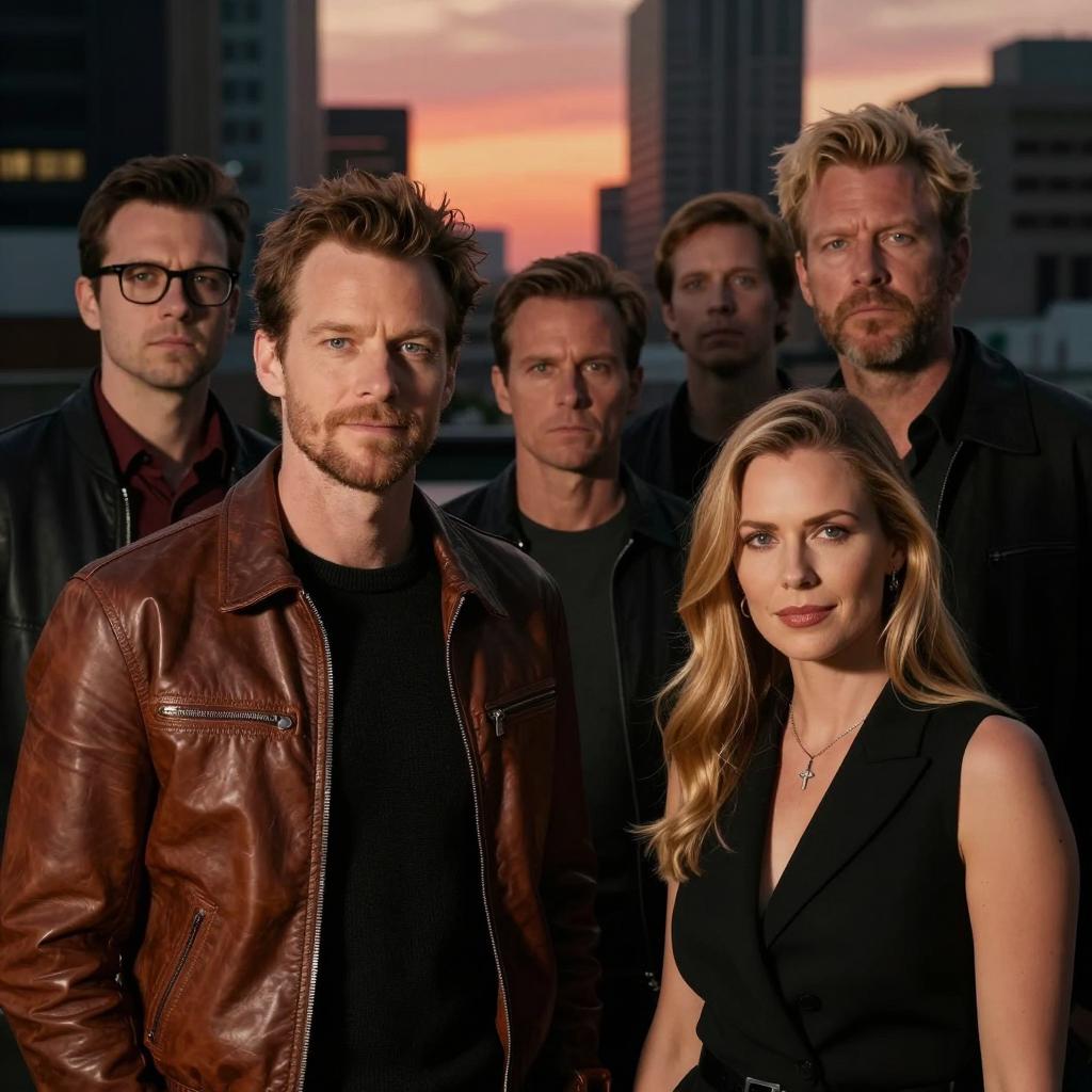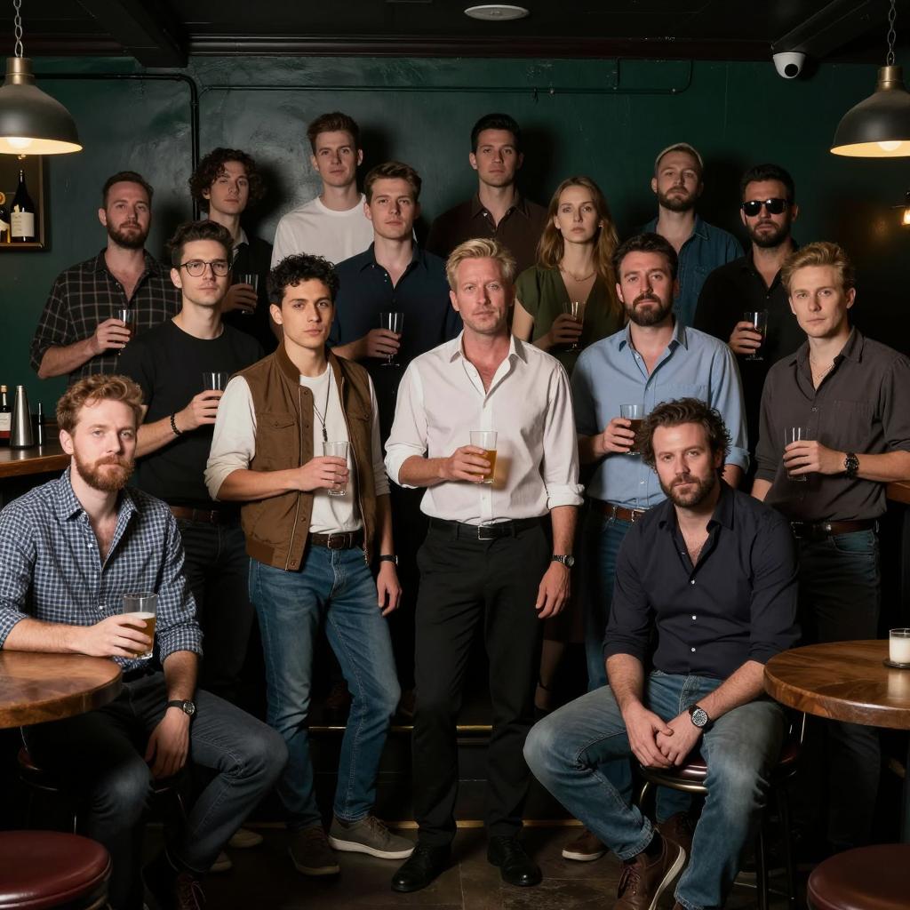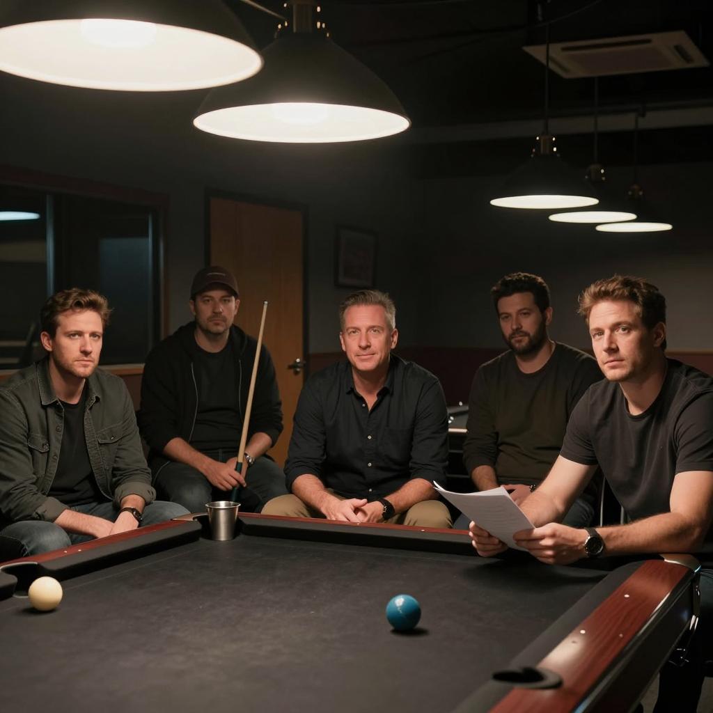 Photograph of six men sitting around a black pool table in a dimly lit room. Five men are seated, one standing. They wear casual to business attire. Background includes a wooden door and industrial lighting. Pool cues and metal cups on the table. Man on the far right holds papers, looking slightly to the side. Man in the middle gestures with his hand. Facial expressions are neutral to slightly serious.
