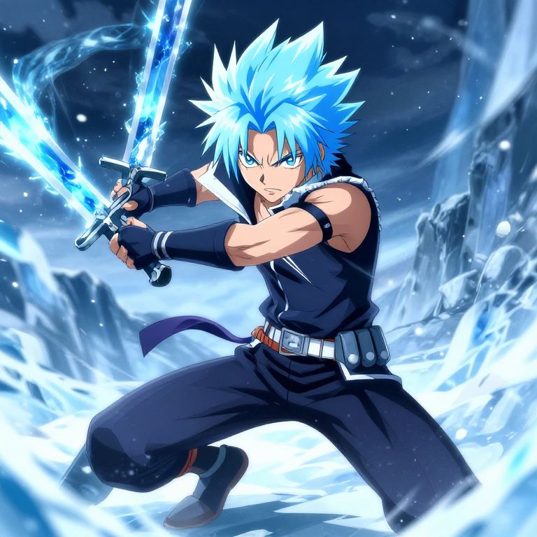 Ice anime character, a fierce fighter with spiky icy blue hair and sharp features, wielding ice swords that shimmer with frost, intense battle stance on a frozen battlefield, dramatic lighting with snow and ice effects, vibrant anime illustration
