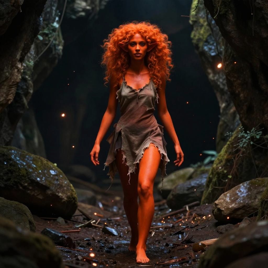 Imp female with bright orange skin, wild curly hair and pointed ears, barefoot and wearing a ragged dress, surrounded by floating embers, in a mystic underground cavern, atmospheric lighting