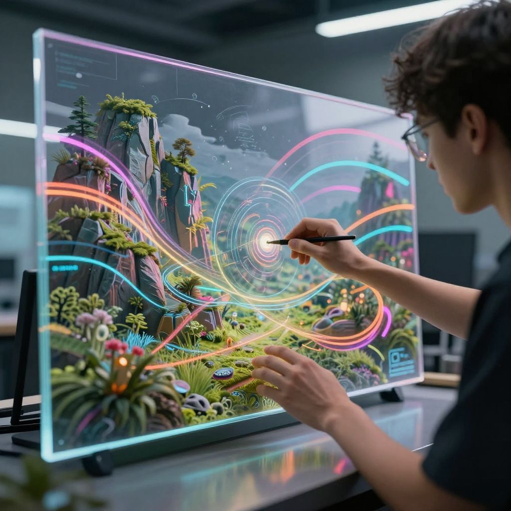 AI art realistic visualization of a digital artist crafting virtual landscapes on a transparent screen, neon-colored light trails following hand movements, futuristic studio setting with reflective surfaces, hyper-detailed textures showing the blend of creativity and artificial intelligence.