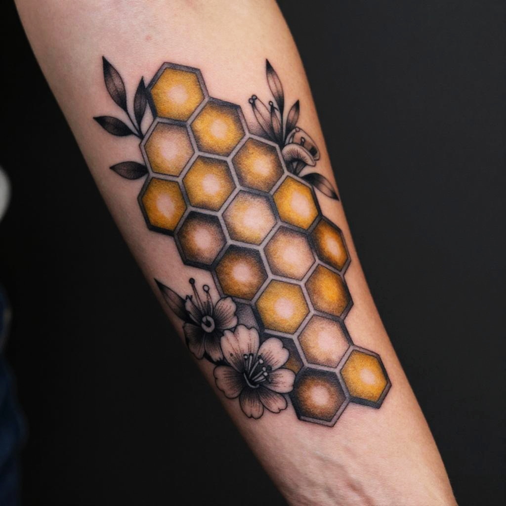 Honeycomb pattern tattoo intricately designed on forearm, sharp geometric shapes with subtle shading and a 3D effect, combined with delicate floral elements, warm golden-yellow and black ink tones, realistic skin texture, hyper-detailed style