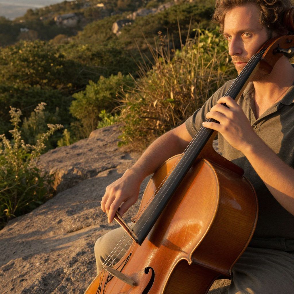 Photograph of a man with curly brown hair playing a wooden cello outdoors on a rocky hillside, surrounded by greenery and sunlight.
