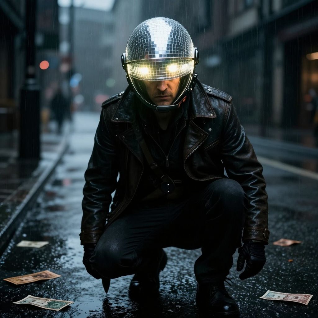 Photograph of a serious man in a wet, dark alley wearing a reflective silver helmet and black leather jacket, rain falling, city lights blurred in the