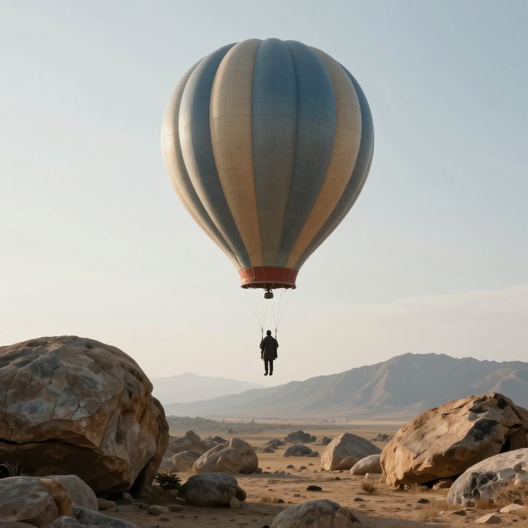 In a desolate landscape where gravity bends to whimsy, a lone figure stands tethered to a colossal balloon, defying convention as it floats serenely above scattered boulders and distant mountains.