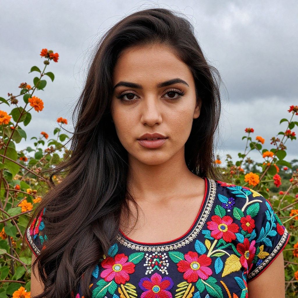 Photograph of a young woman with long, dark hair, wearing a colorful floral embroidered top, standing in a field of orange flowers under a cloudy sky