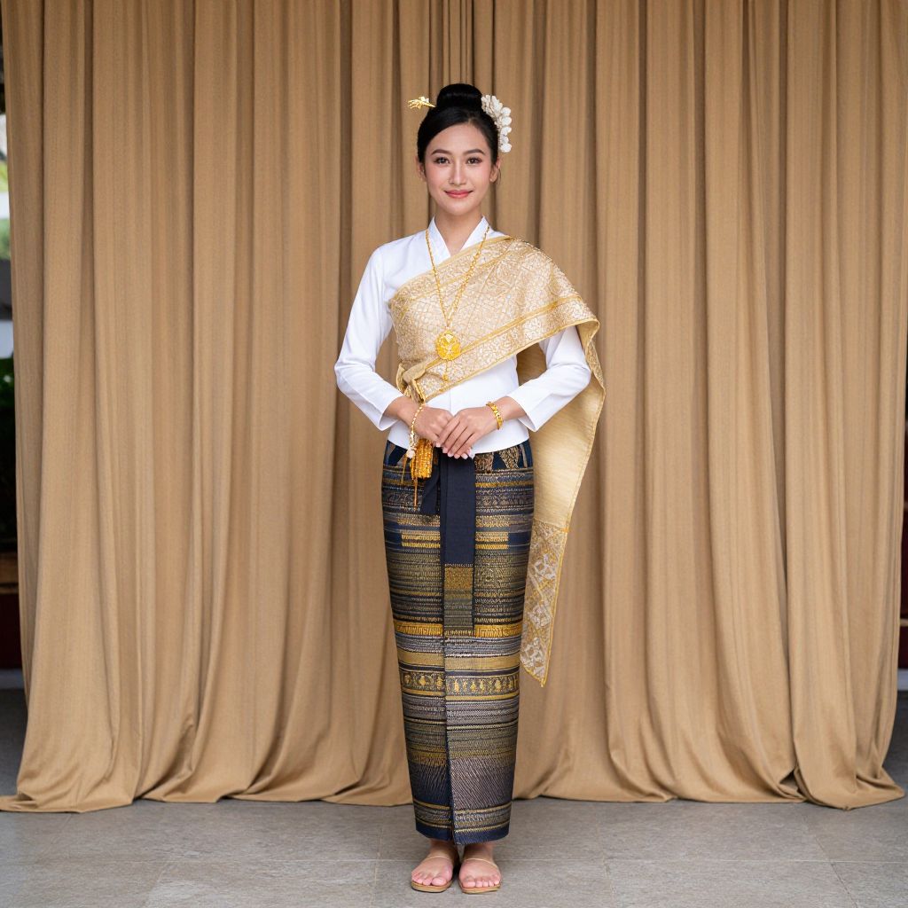 Photograph of a smiling Asian woman in traditional Thai attire, white blouse, gold patterned sarong, black ornate skirt, floral hairpin,