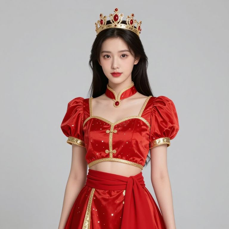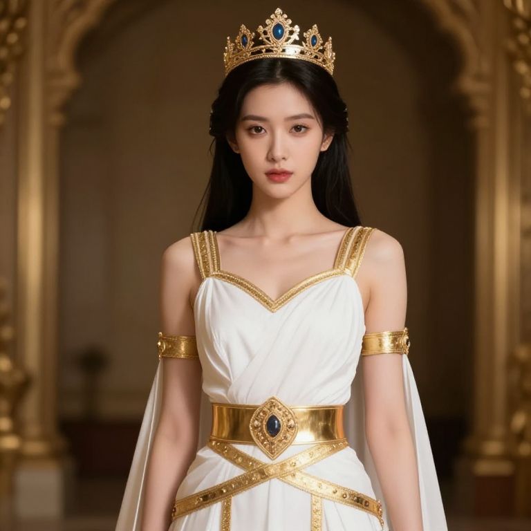 Female wearing a white and gold outfit with a crown on her head and a gold belt on her waist.