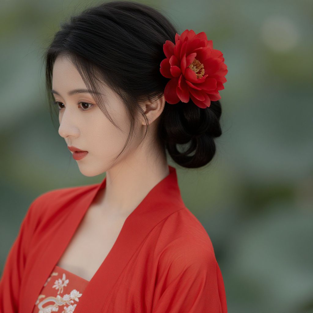 "Woman Hanfu Dress, a close up of a woman in a red dress with a flower in her hair"