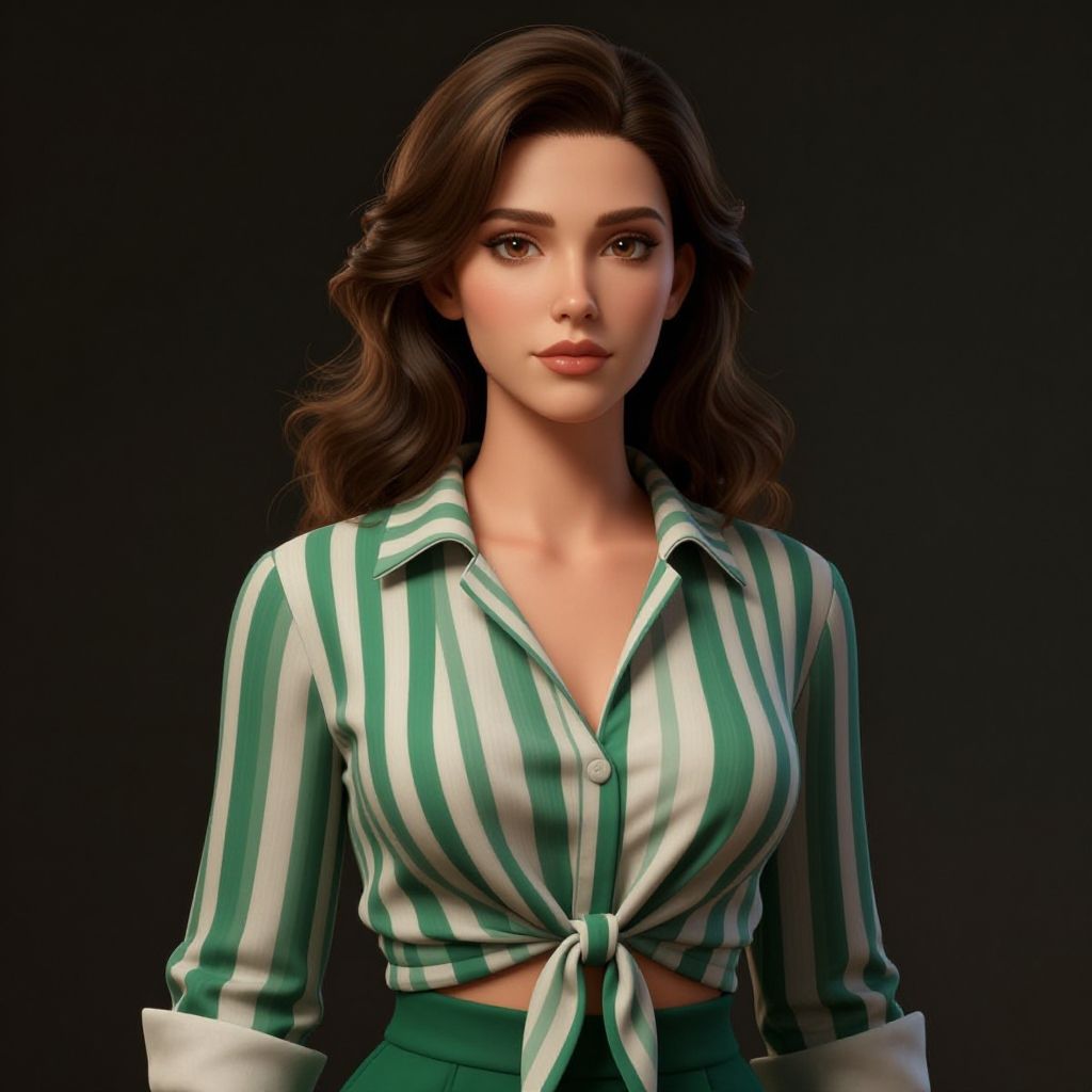 A woman wearing a striped shirt with a knot around the front, high quality 3d realistic, olive skin, elegant colorful, high quality image, green clothing, wavy hairstyle, ekaterina, business attire, digital fantasy art, in stunning digital paint, (octane render) fantasy style, photorealistic anime render, aesthetic octane render!, detailed matte fantasy portrait, dark, digital fantasy illustration, elegant digital painting