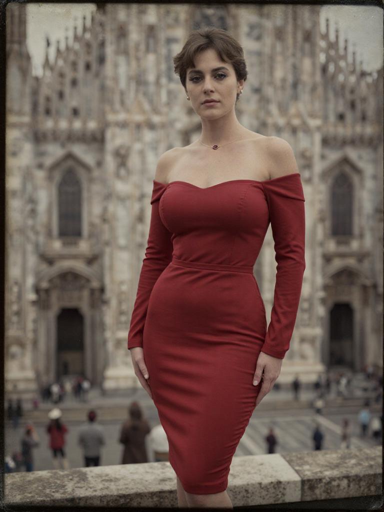 A Pear-shaped body type woman in a chic, off-the-shoulder red bodycon dress, knee-length with long sleeves, poses gracefully on a Cathedral rooftop with tourists. Visual style: Collodion wet plate. Sexy. Pretty face and beаutiful eyes. Big breasts
