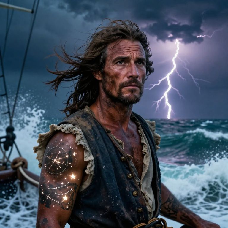 A weathered sailor's portrait emerges from a stormy seascape, his tanned face etched with deep creases and determination. Amidst turbulent waves crashing against his ship, the wind whips through his salt-stained clothes. An intricate tattoo of a celestial map adorns his forearm, its glowing stars weaving like constellations in the night sky. As lightning fractures the darkness, it illuminates not only the sailor's resolute expression but also the hidden depths of the chaotic sea, mirroring the complexities within him. The vivid colors and textures create an emotional gradient, capturing the raw intensity of a life where danger and beauty intertwine.