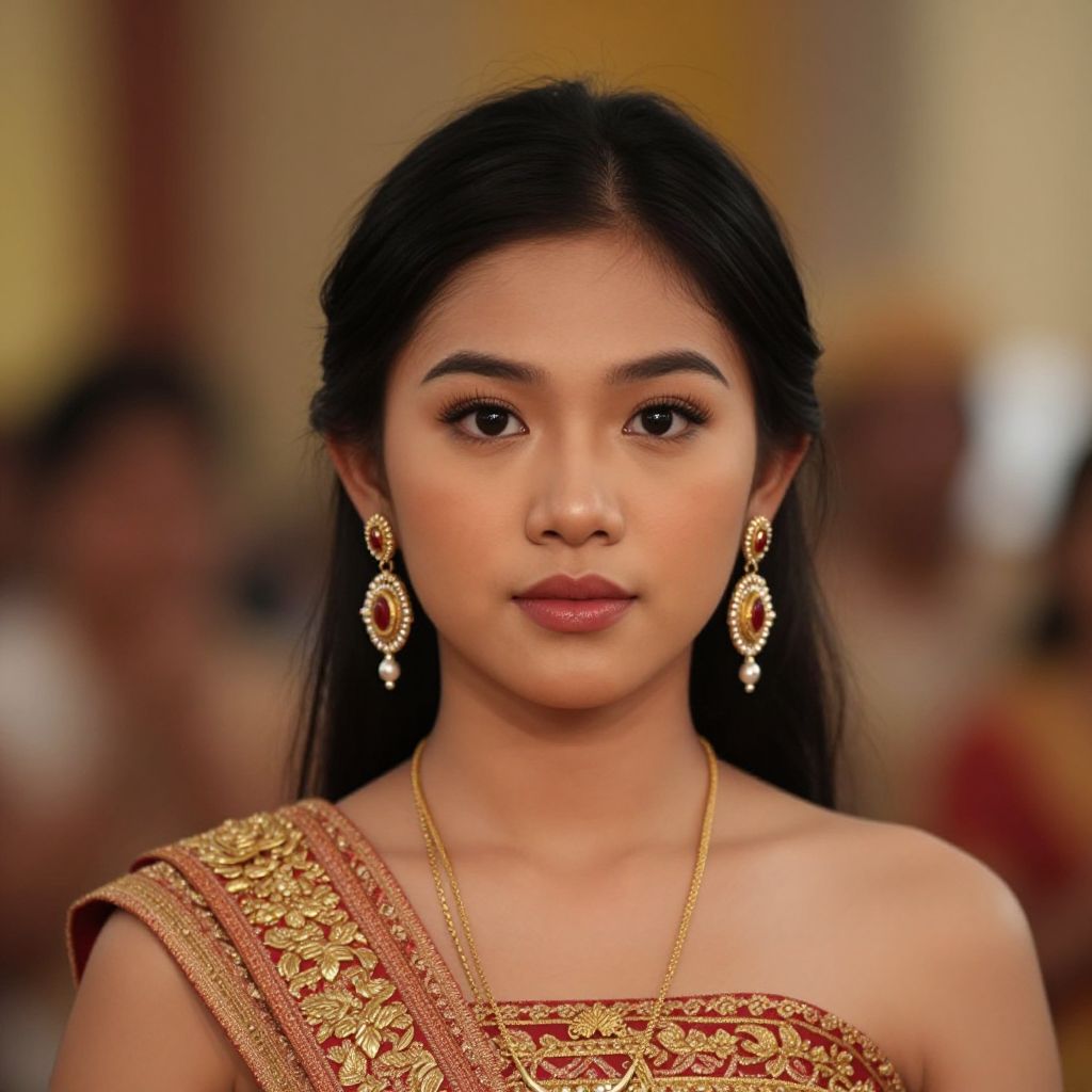 Photograph of an Asian woman with long black hair, wearing a gold and red intricately embroidered saree, showcasing a traditional Indian style. She has a fair skin tone, almond-shaped brown eyes, and subtle makeup. She is adorned with large, ornate gold earrings and a gold necklace. The background is blurred, featuring warm, golden hues and indistinct figures, suggesting a formal or cultural event. The image focuses on her serene, composed expression and traditional attire.