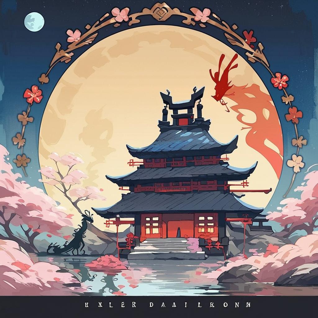 Score_9, score_8_up, score_7_up, score_6_up, score_5_up, score_4_up, A magnificent dragon temple under a chinese night sky with an eastern dragon silhouette over the moon, rating_safesource_furry, eastern dragon, silhouette, temple, outside, sky, moon, window, reflection, pond, plant, flower, asian mythology, east asian mythology, chinese zodiac, cjk character, text, food creature, cherry blossom, breeze, lineless, watercolor painting, painting