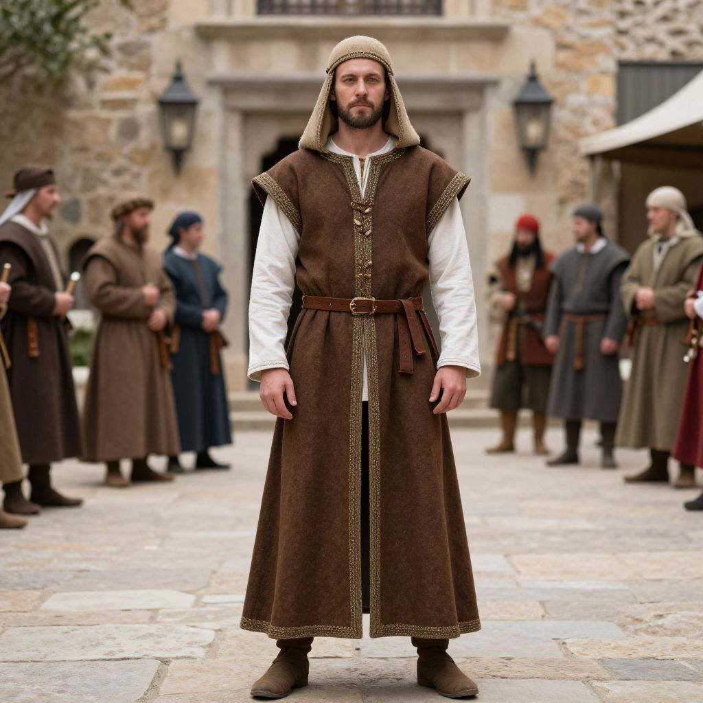 Photograph of a bearded, white man standing center-frame in a medieval village. He wears a brown, sleeveless tunic with white long sleeves, brown belt, and brown boots, with a beige hooded cloak. The background features a stone building with a lantern, and several people in medieval attire, including cloaks and hats, standing in a courtyard. The stone pavement and rustic setting enhance the historical ambiance. The man's expression is neutral, and the lighting is natural, highlighting the textures of his clothing and the stone surroundings. The image has a realistic, historical reenactment style.