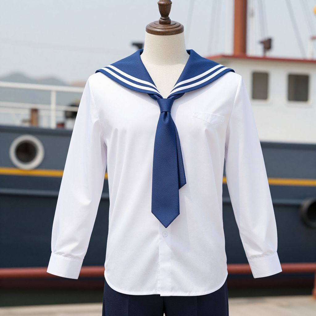 Photograph of a white sailor shirt with navy blue collar and tie, displayed on a mannequin, against a blurred ship backdrop.
