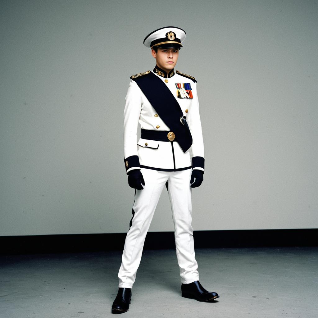 Full body portrait of a young man wearing a white formal military uniform with long sleeves, black gloves, black boots, epaulettes, and a white peaked cap. The uniform features a black sash, gold buttons, and medals on the chest. The subject stands against a plain gray background.