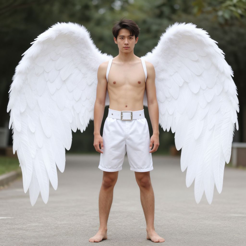 Angel costume guy, wings, solo, 1boy, male focus, angel wings, angel, belt, feathered wings, photo background, outdoors, full body, white wings