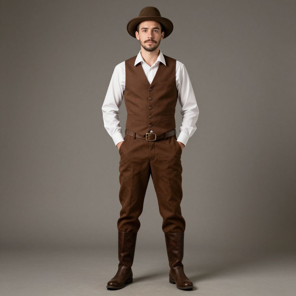 Photograph of a man standing against a grey gradient background. He has a light complexion, dark brown eyes, and a trimmed beard. He wears a brown wide-brimmed hat, white long-sleeve shirt, brown vest with buttons, brown trousers, and black leather boots. His hands are in his trouser pockets, and he has a belt with a silver buckle. The man's expression is neutral, and the lighting is even, highlighting the textures of the clothing and his smooth skin. The overall style is reminiscent of a vintage Western or cowboy look.