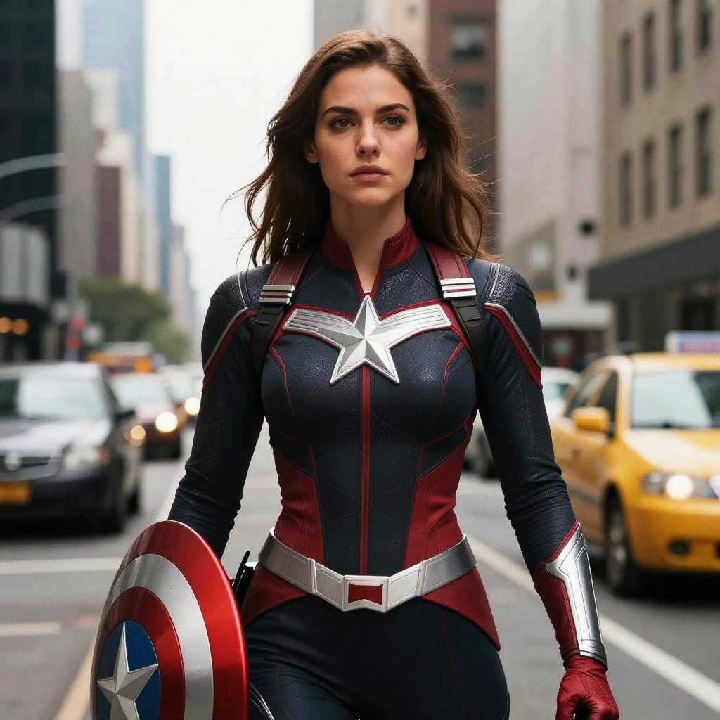 Photograph of a young woman with long, wavy brown hair, wearing a tight, dark navy blue and red superhero suit with a white star on the chest. She holds a circular shield with a red, white, and blue star pattern in her left hand. She has red gloves and a silver belt. The background shows a city street with blurred yellow taxis, white cars, and tall buildings. The woman's intense expression and confident stance suggest determination. The image is sharply focused on her, with a shallow depth of field, making the background slightly blurred.