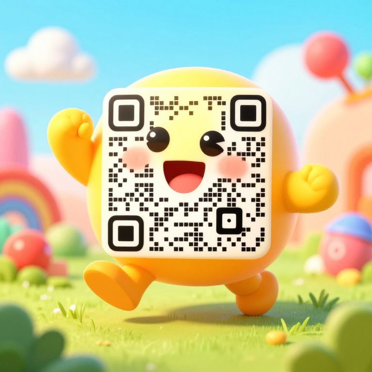 A playful qr code emoji character with animated facial expressions, bouncing in a whimsical cartoon world filled with bright colors and quirky shapes, friendly and cheerful vibe, detailed digital art