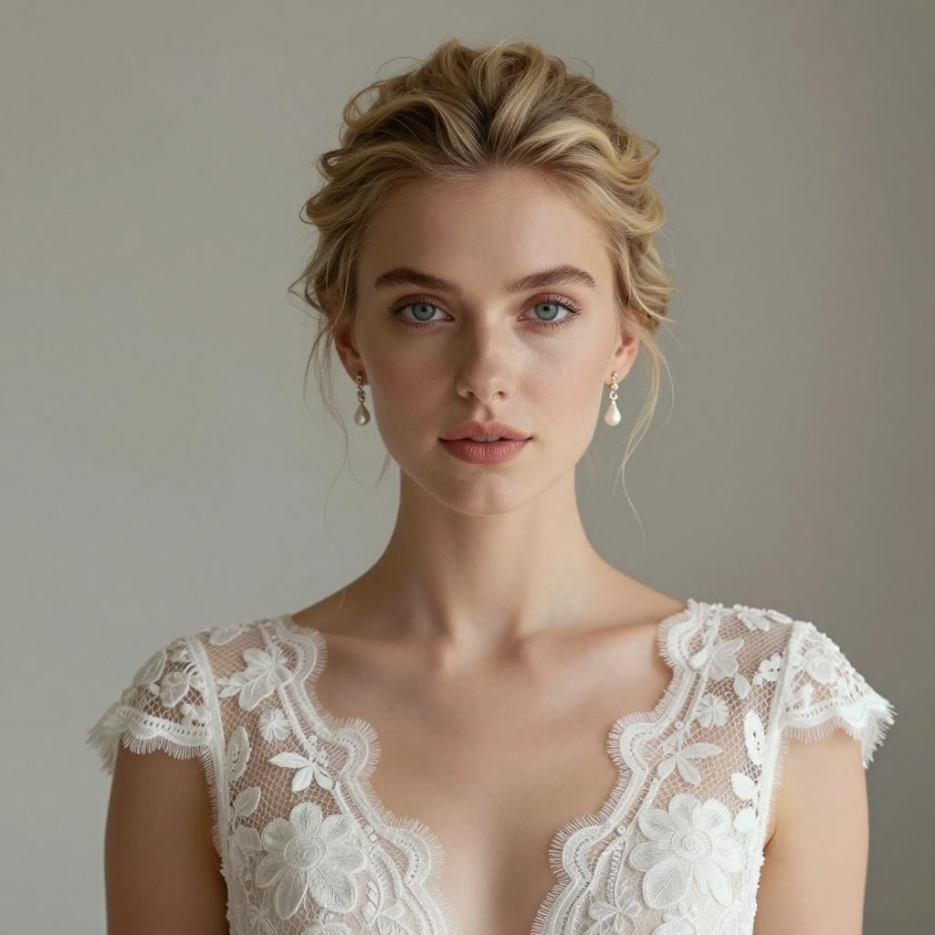 Blonde hairstyle female, photorealistic portrait, beautiful blonde woman, blue eyes, shoulder-length wavy hair, wearing off-shoulder beige top, small pendant necklace, light makeup, pink lipstick, focused expression, blurred pink flowers in background, sunlight, clear skin, soft shadows, realistic ures, upper body shot, centered, close-up, natural light, summer vibe, feminine, delicate jewelry, casual elegance