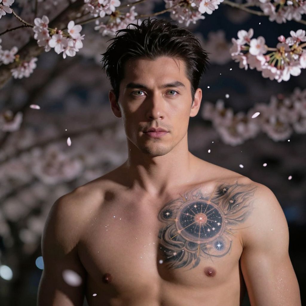 A charismatic man with piercing eyes, blending seamlessly into a dark sky, stands amidst a sea of cherry blossoms. His intricate tattoo of celestial bodies on his chest shimmers with starlight, enhancing an otherworldly allure. The harmonious interplay of light and shadow illuminates his determined expression and chiseled jawline, while the floating petals create a mesmerizing dance. This captivating portrait invites viewers into a journey between dreams and reality.